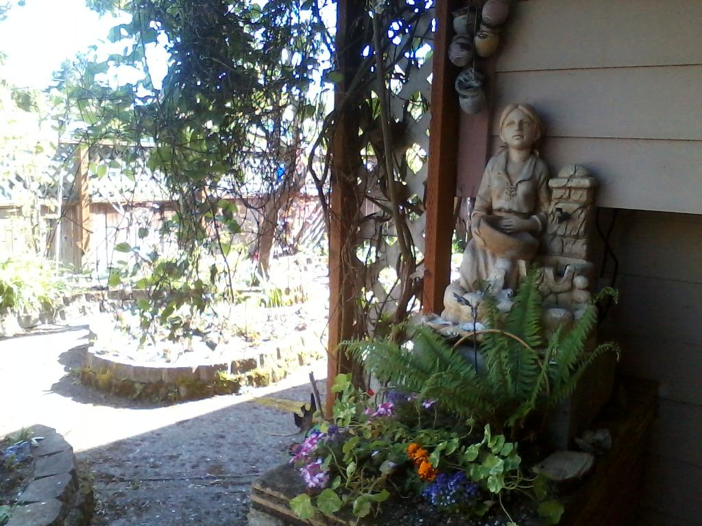 Large backyard garden features a fountain, fragrant roses, unique flowers, grapes, fruit trees and shaded sitting area for outdoor living. Also, easy access to the designated covered smoking area.