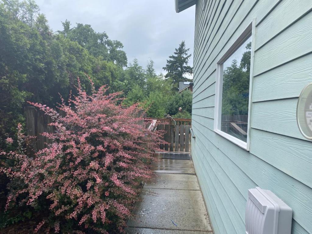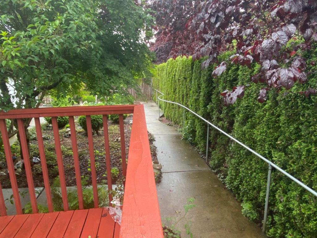 The backyard of the home contains a pathway with railing you can walk with. The backyard is quiet and peaceful especially while sitting on the patio.